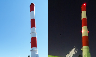 Exhaust gas discharged from the factory is discharged from a high chimney of 89.5 m while removing harmful substances with a demister and continuously monitoring it for 24 hours. The vaporized water vapor from the water sprayed by the demister is in white.