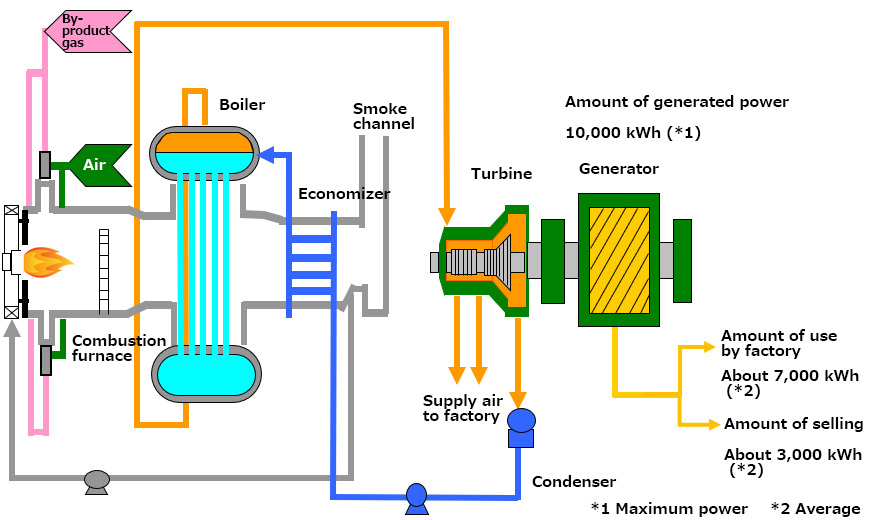We use the by-product gas generated in the production of carbon black to generate electricity in-house. We cover all the electricity used in the factory, and sell the surplus electricity to neighboring factories.